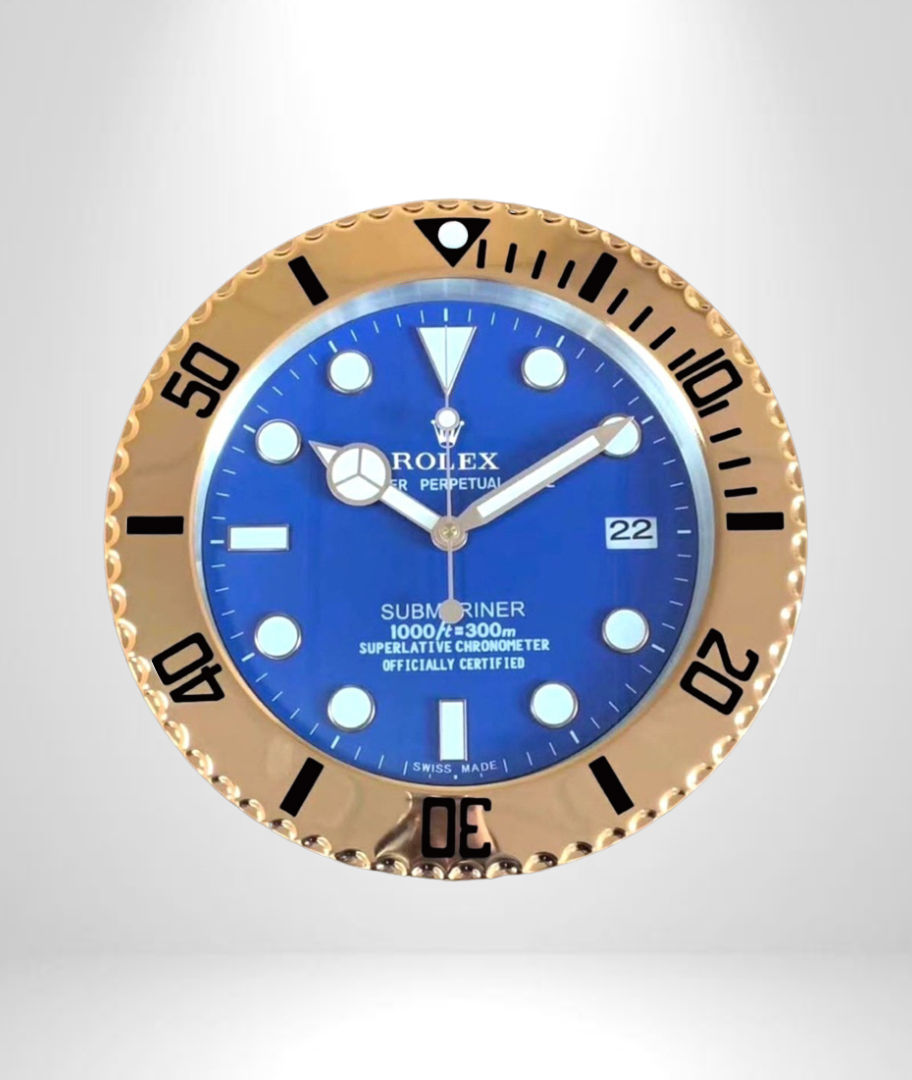 Bring timeless elegance to your interiors with the Rolex Submariner Rose Gold & Blue Wall Clock, inspired by one of the most iconic luxury timepieces in the world. With its bold blue dial and radiant rose gold finish, this wall clock captures the spirit of sophistication and prestige.