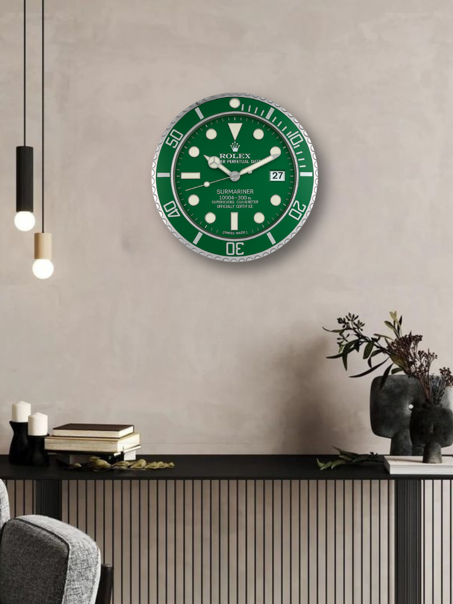 Elevate your space with the Rolex Submariner Wall Clock in striking green, a symbol of luxury, precision, and timeless design. Inspired by the iconic Submariner watch, this wall clock brings the elegance and heritage of Rolex into your home or office. Its vibrant green dial is complemented by sleek silver accents, perfectly balancing style and functionality. Ideal for collectors, enthusiasts, or anyone seeking a statement piece that reflects sophistication.